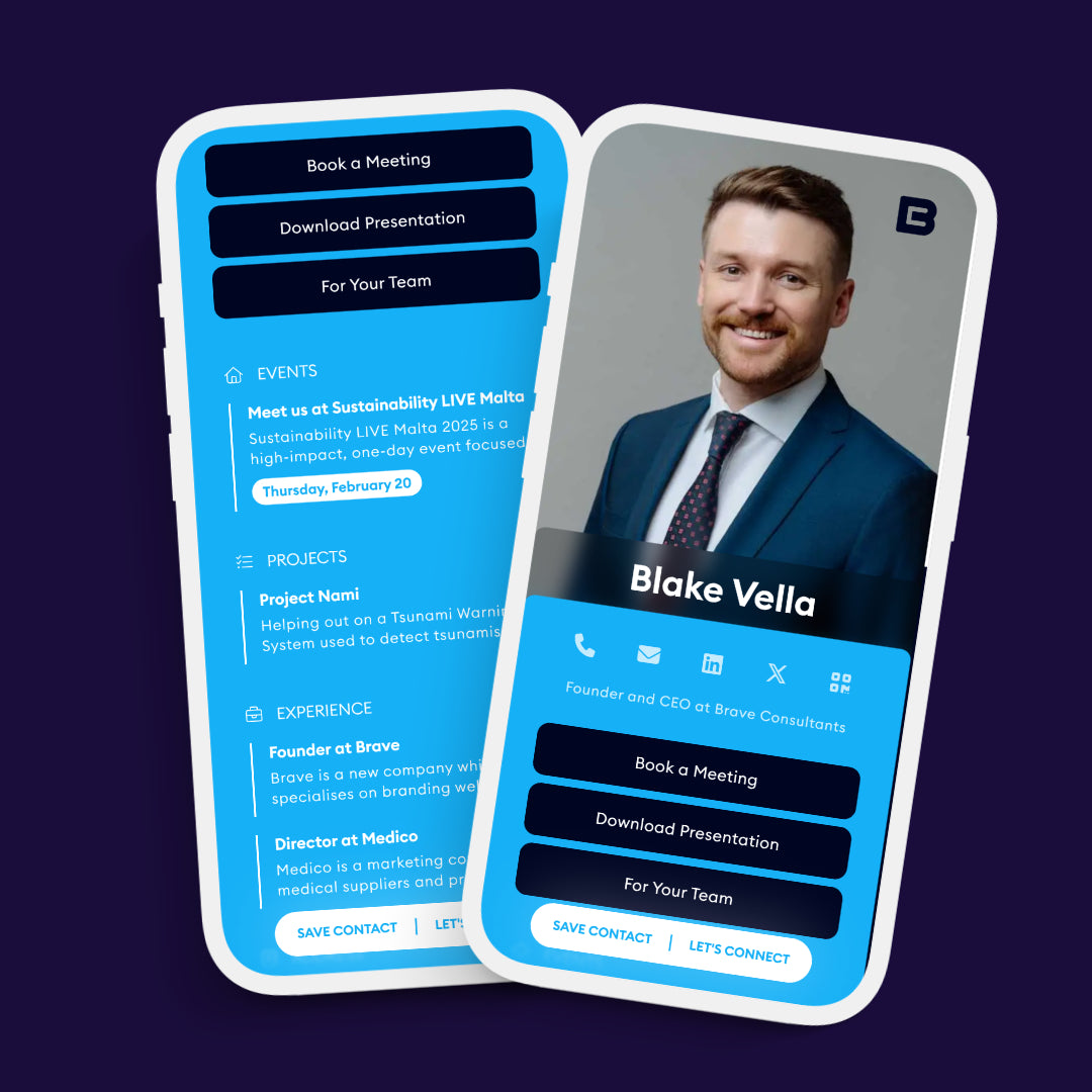Our PRO Plan has all the benefits of the Essentials plan (see feature comparison), but also provides a standardised look matching your brand ID with your logo and unique colour schemes. Professional Plan allows you to make great first impressions, and grow your network in a contactless and eco-friendly way.